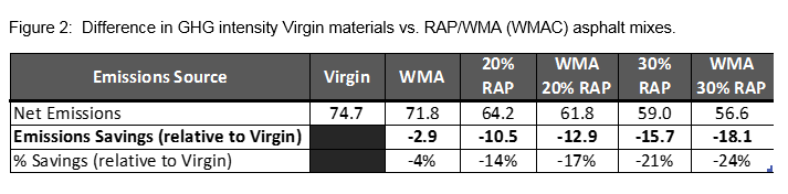 Figure 2:  Difference in GHG intensity Virgin materials vs. RAP/WMA (WMAC) asphalt mixes.