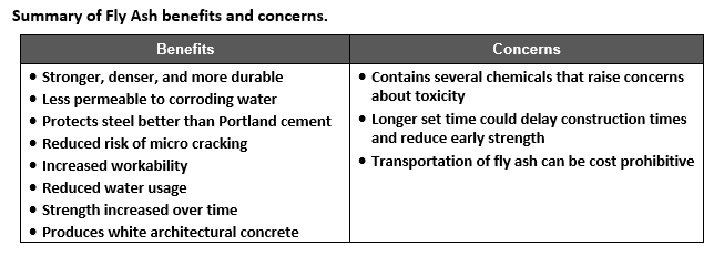 Fly Ash is a waste by-product from the combustion of coal. It is a very fine powder composed predominantly of silica, and is generally a light tan color. When combined with water, it produces a cementations mix that can be used as a substitute for a portion of the quantity of Portland cement in a blended concrete mix, generally 0 – 30%. However, the fly ash must meet strict standards, including standards on the fineness of the grain sizes, and that the composition is >20% lime. These standards are typically represented by Class C fly ash. Figure 5 provides a summary of the benefits and concerns associated with the use of Fly Ash.