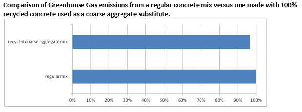 The GHG emissions associated with virgin aggregate (rocks) are due to a combination of combustion emissions from transportation and material extraction. If using recycled aggregate, which is old concrete crushed to size, GHG emissions are reduced due to the avoidance of mining, crushing, and transporting virgin aggregate. Figure 4 below shows the GHG savings of using 100% recycled aggregate in a typical concrete mix. One can see that the GHG savings are real but they plateau at about a 3% reduction. Additionally, current ASTM limits on structural concrete limit recycled coarse aggregate to 10%. While project specific testing can permit larger uses of recycled aggregate, using 100% recycled coarse aggregate would be very rare. Thus, the carbon reduction benefits of this strategy are likely overestimated. The use of recycled aggregate, however, has benefits beyond carbon reductions. Most notably, recycled aggregate conserves a non-renewable resource that is mined from land and waterways and can have environmental impacts far beyond carbon impacts. Therefore, while recycled aggregate should not necessarily be a primary strategy for reducing the carbon content of concrete mixes, it should remain a component of public purchasing when appropriate. Additionally, in remote areas, the transportation of aggregate can be a large environmental and financial cost, which could drive the use of recycled aggregate even further.