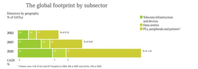 - The updated analysis of the SMARTer 2020 report shows the relative shift in the energy footprint of the IT sector from devices to data center and networks, tracking the ongoing growth of internet-based computing and the shift to thin client devices like tablets.