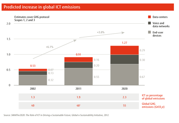 - The SMARTer 2020 report estimated that the ICT Sector globally is responsible for 2% of the world’s anthropogenic GHG emissions, and is expected to grow 6% per year through 2020.