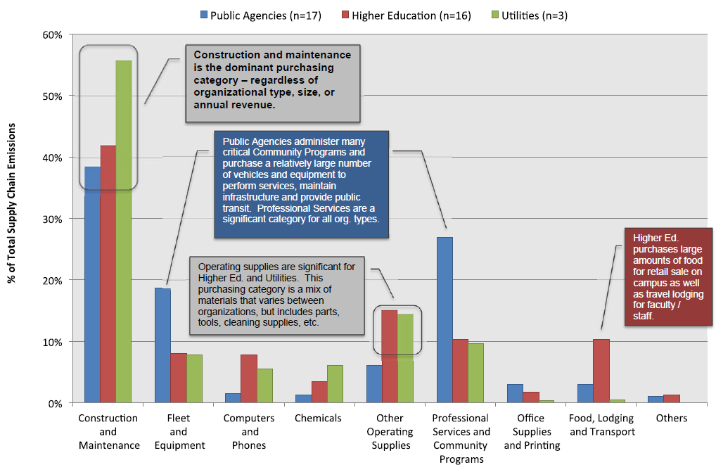 By understanding more about those categories of spending that have especially high GHG emissions, government and higher education purchasers can zero in on the most effective strategies for reducing their carbon footprint. They can specify actions such as the use of recycled content products, energy efficient and lower-GHG processes for material production, low GHG fuels and energy efficient vehicles and equipment, and lower emissions meetings for contractors vis-à-vis teleconferencing.