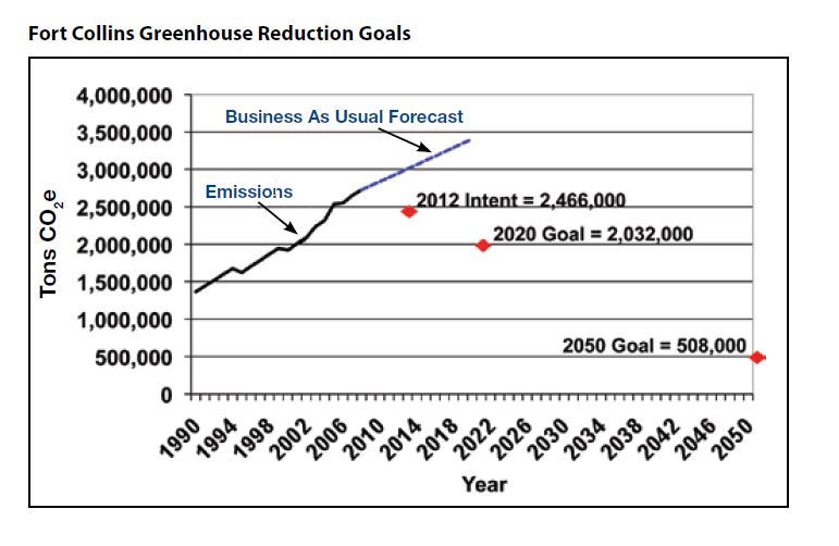 Fort Collins updated its 2001 Climate Action Plan in December 2008, adopting GHG emissions targets of 20% reduction by 2020 and 80% reduction by 2050, compared to 2005 levels. In 2014, the city issued a resolution to consider developing a new, more aggressive CAP to achieve 80% reduction by 2030 compared to 2005 levels and carbon neutrality by 2050. In its 2013 Status Report, the city recognizes the potential challenge of such ambitious new goals, as an increasing population and economic activity led Fort Collins to experience small increases in GHG emissions in 2013 and 2012. However, the overall community emissions are still down by close to 5% and per capita emissions are down 17.7%, compared to 2005 levels.